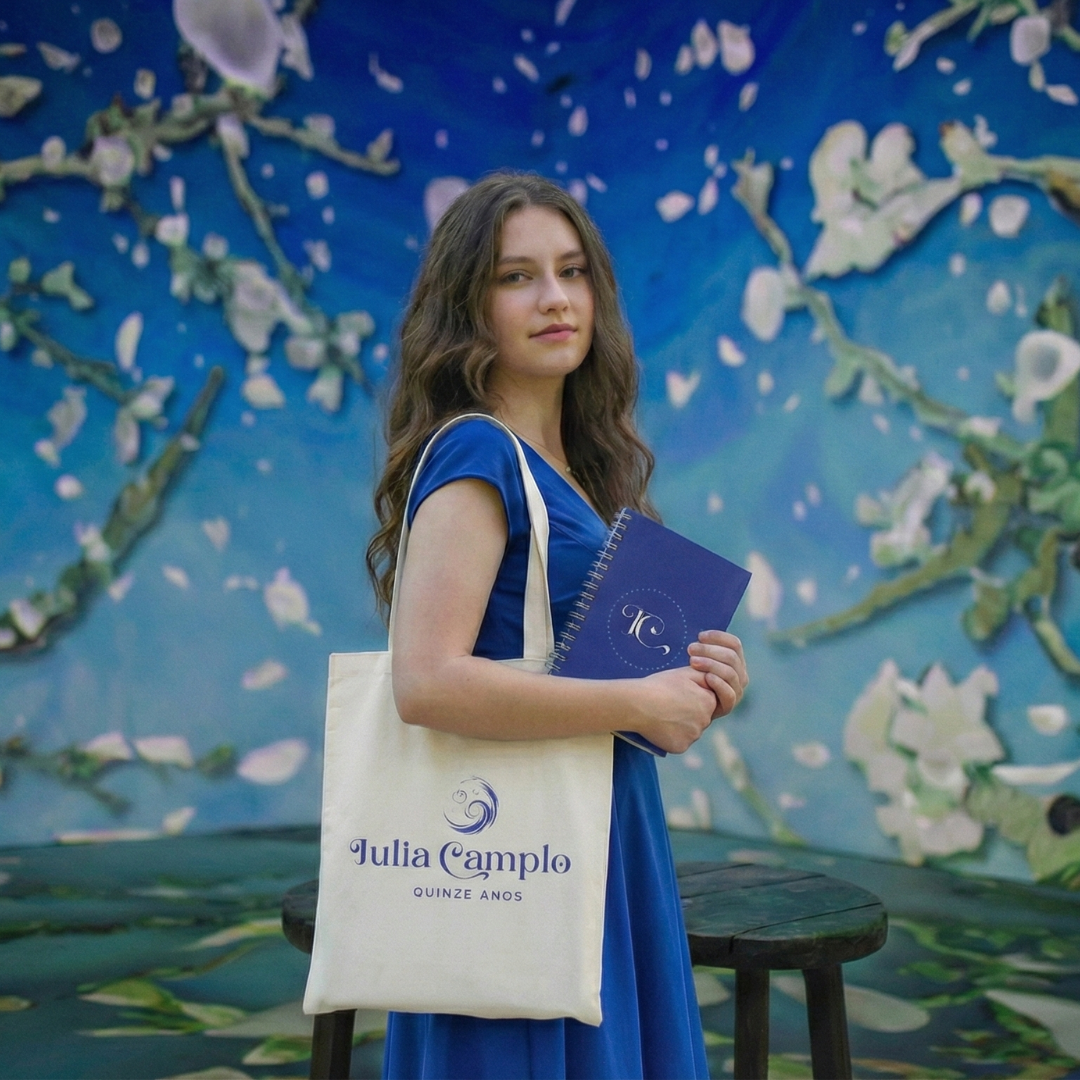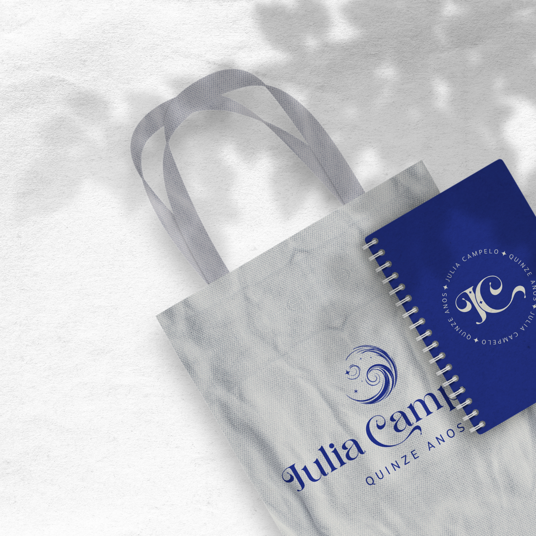 A lua crescente foi escolhida por dois motivos: ela remete à noite, criando a atmosfera do evento, e simboliza crescimento e início de um novo ciclo, o que os 15 anos representam. As estrelas em tamanhos diferentes trazem o brilho e a magia de um céu estrelado, com um toque sofisticado que enriquece o conjunto.